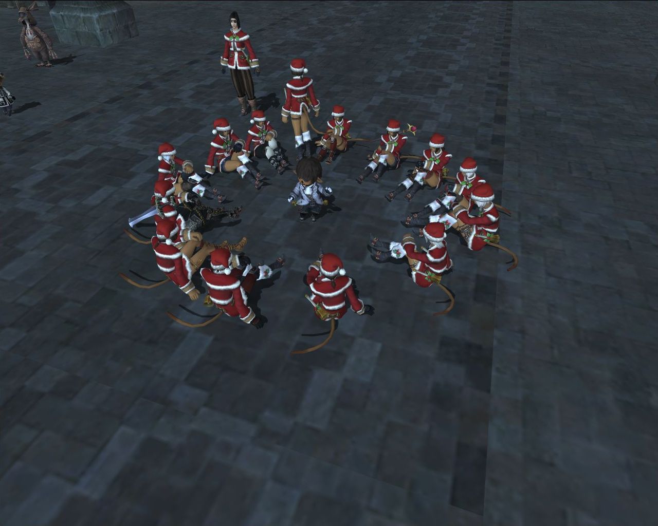 円になって撮影。真ん中のタルは見物人です。タルをタゲロックして移動すると調節しやすい。
