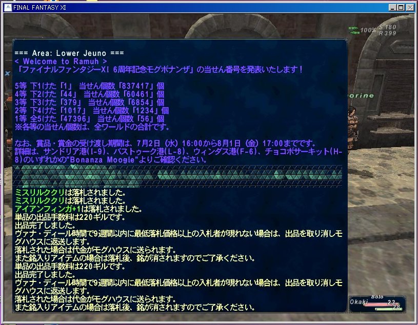 NQ6個はジュノ上層の酒場に店売りしました。HQの価格を競売で見たら、約14000ギル。ウマー。