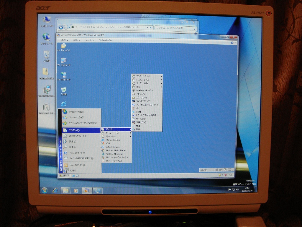 仮想XPのメニューを表示するだけでもたつく有様。これはよほど必要に駆られないと使わないかも。まあ、XP ModeはXPのライセンスを持っていなくても使えるらしいので、無いよりはマシなのかな。