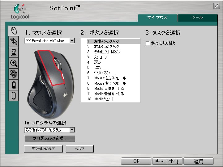 ロジクールのマウス用設定ソフトのSetPointには若干機能制限があり、特定のボタンに特定の機能が割り当てられなかったりします。たとえばスクロールホイール手前の検索ボタンに中央ボタンの機能を割り当てられなかったり。