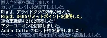 その後、カンパニエバトルをやったりしたけど、さすがのKazanもミケさんとその部下に囲まれるとフルボッコにされてました。円月浪士組組員はPC群が美味しくいただきました。ウマー。経験値3665ゲット。