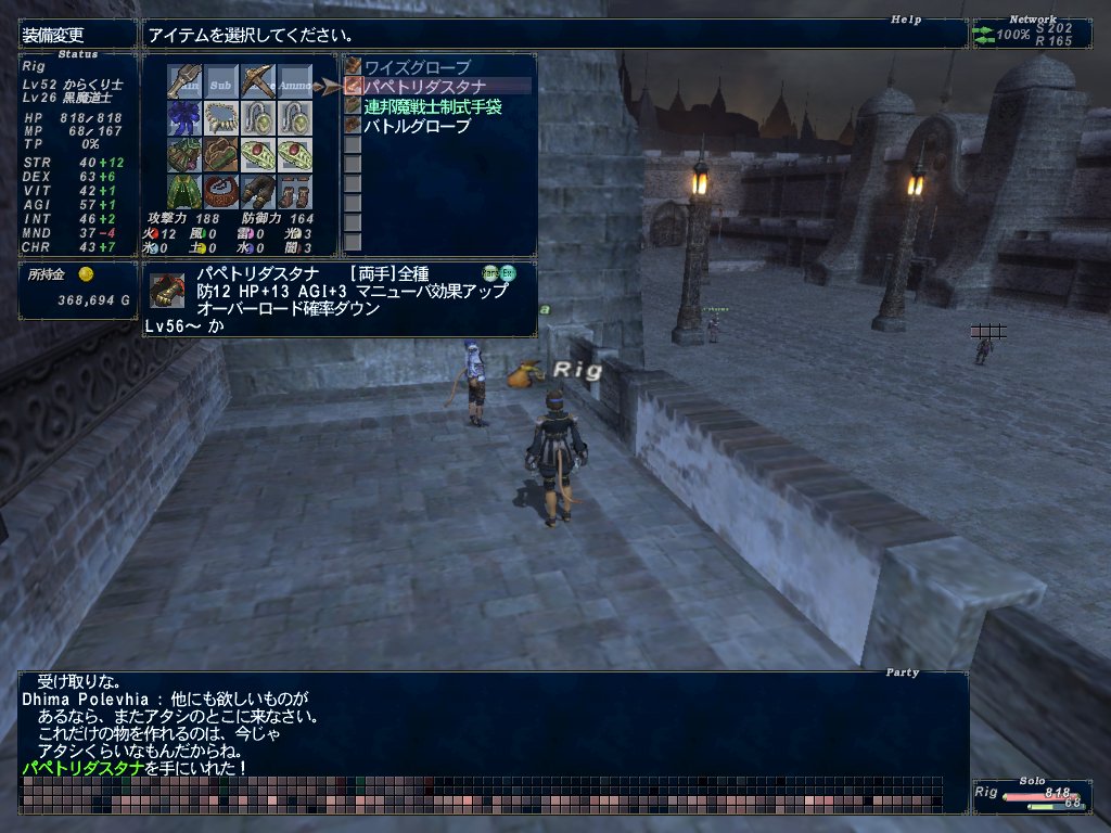 日付が変わったので昨日注文したからくり手AFを受け取りに白門に飛びたいので、ユタンガ大森林のOPから本国に戻ってサポ黒にチェンジしてデジョン。AFを作ってくれるNPCに話しかけてからくり手AFゲット。