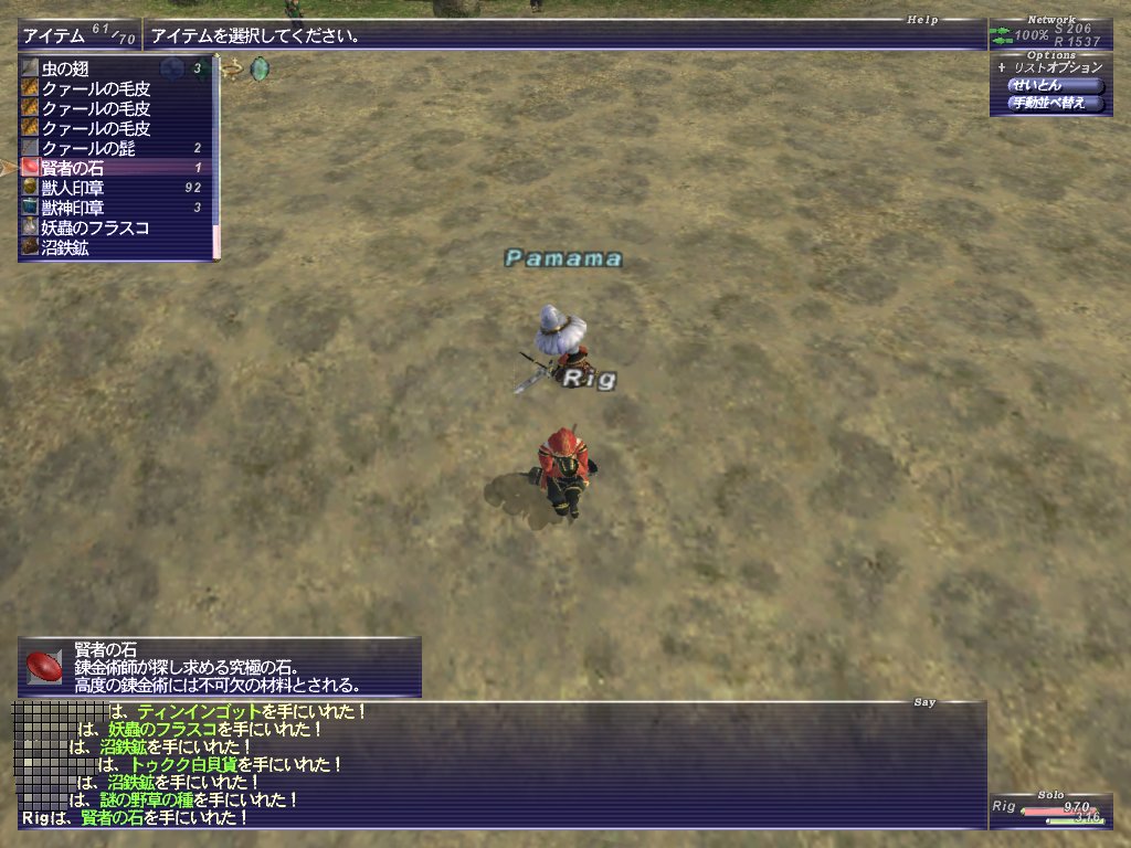 からくりがLv61になりました。特に変化はないです。Lv62まで聖地ジ・タに篭もる予定だったけど、カンパニエに移行しました。相変わらず攻撃は当たらず、回復ポイントで稼ぐ感じです。ユニオンの戦利品で賢者の石をゲットしました。幾らだろう?