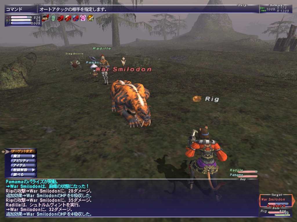 当たらない攻撃をなんとかしようと思い、ジャグナー森林〔S〕のWar Smilodonを倒しに行く。敵レベル57~60だそうです。私の格闘スキルは144で、このスミロドンで190まで上がる予定。そこまで上げるかは知らないけど。ついでにフェローのラディールさんも呼んで殴る。