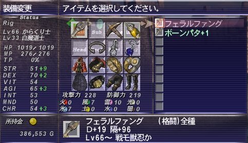 眠たくなるまで転戦して、ようやくLv66になりました。格闘武器のフェラルファングを装備できるレベルです。早速装備…あれ?