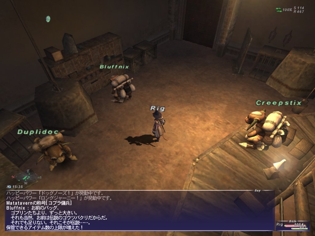 ジュノに飛んで、カバンを拡張することにしました。拡張前のカバンのサイズは70。競売でアイテムを買い漁ってジュノ下層のゴブリンに渡します。2回の拡張で合計80万ギルくらい飛んでいった。