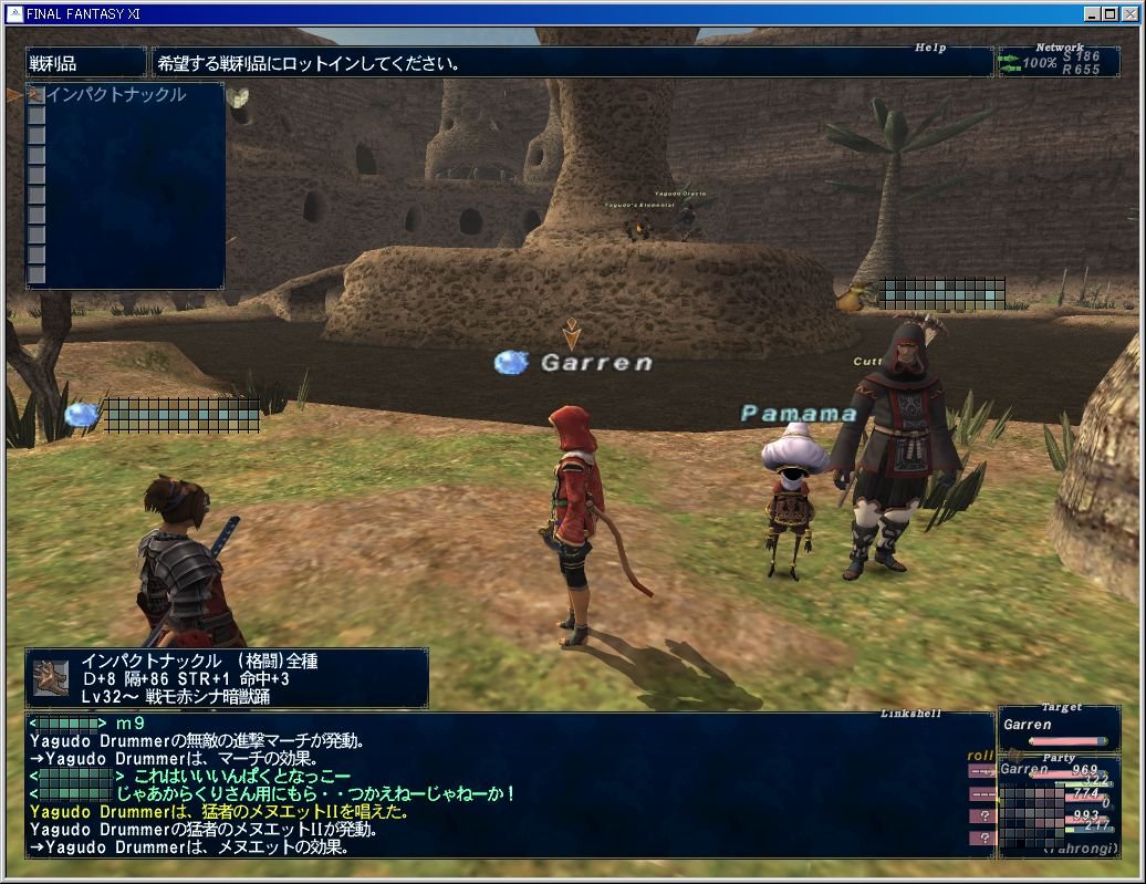 寝る前に旧落人の篭手のNMやりに行くか-って流れになったのでいく。あいびーたんがNMを釣る。ドロップアイテムはインパクトナックルであった。