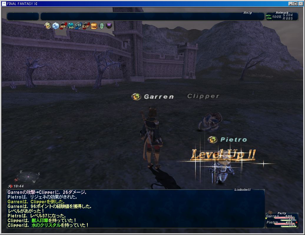2垢タルがLv36で停滞していたのでバタリア丘陵〔S〕でGarrenの学者とPT組んでレベルシンクをしました。狩る獲物はカニ。丁度のカニを連戦で狩りまくる。アニバーサリリングを使って1回の専心が切れるまでやってLv37になりました。