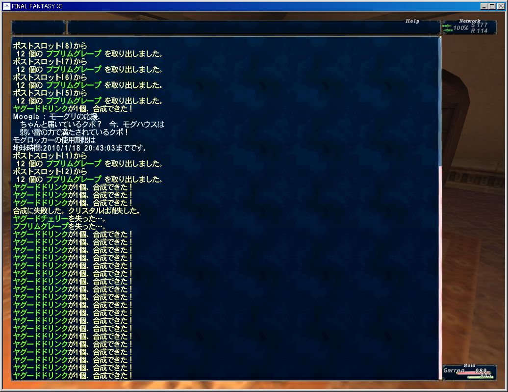 放置バザーのキャラを見ていたら、ヤグードドリンクが一気に13本売れたので在庫を補充しようとして2D分の材料を送って合成。メインキャラは先日調理スキルが60になった。でも1回分割れた。ムキー。