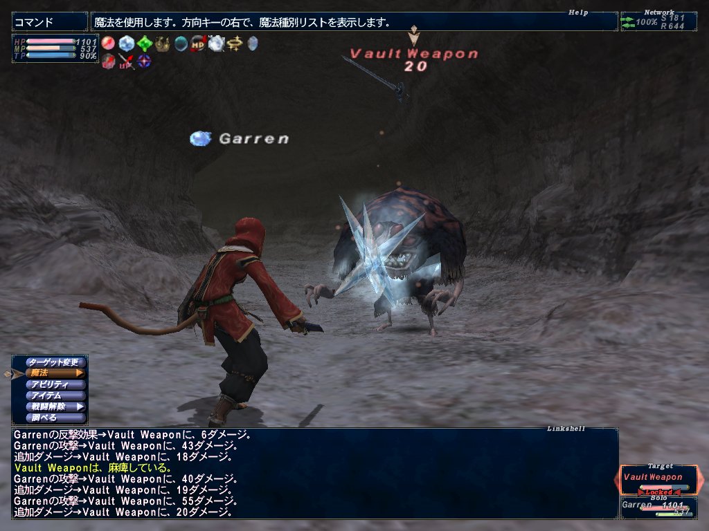 最後はクロウラーの巣〔S〕でクエストを受けて、ブンカール浦〔S〕で???を調べるんですが、魔法感知のジン(ボム亜種)のうろついている中で調べないといけないので緊張しました。ジンがそっぽ向いた瞬間インビジを切って???を調べる。で、調べ終わったら脱出のため呪符リトレースを使用。これもなんとか事故もなく終了。