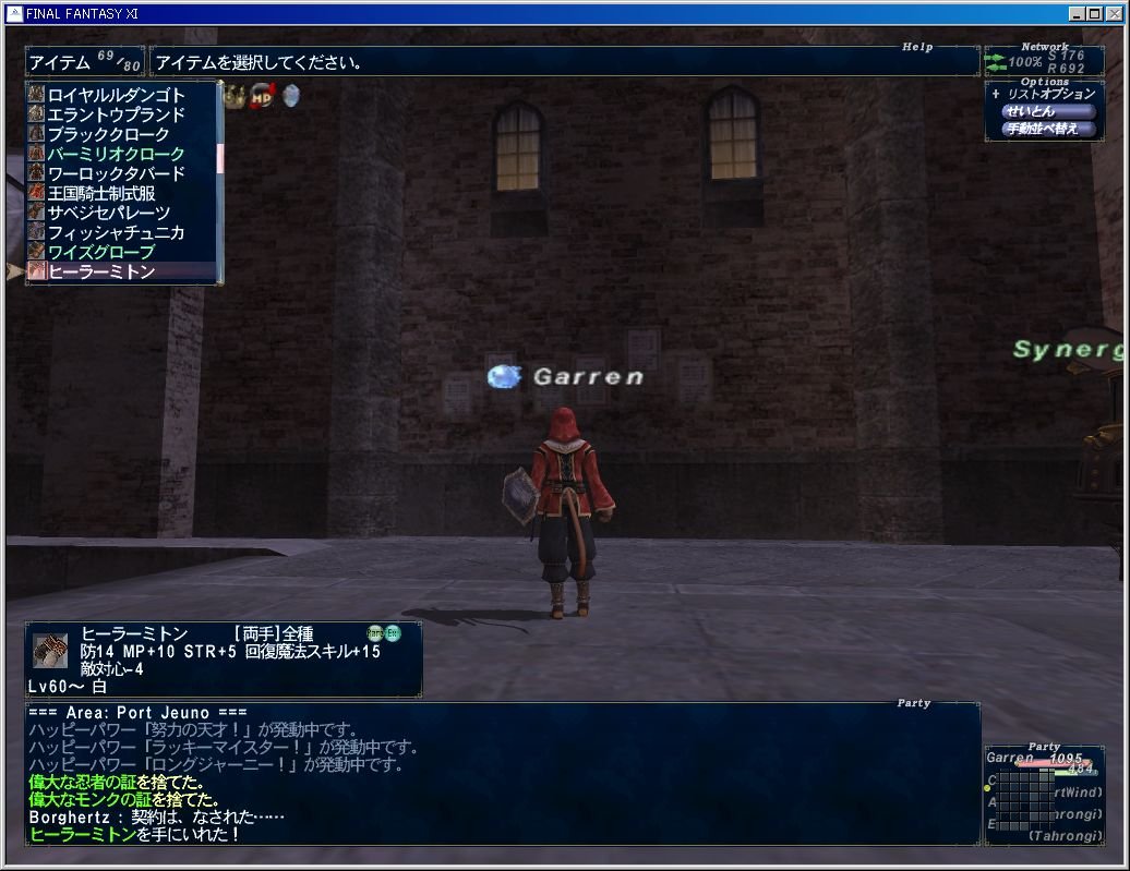 無事闇の炎をゲットしてからテレポで脱出してせしりーにデジョンIIしてもらってジュノに到着。古びた小手と闇の炎を持った状態でジュノ港の免税店前の???を調べて…契約はなされた。