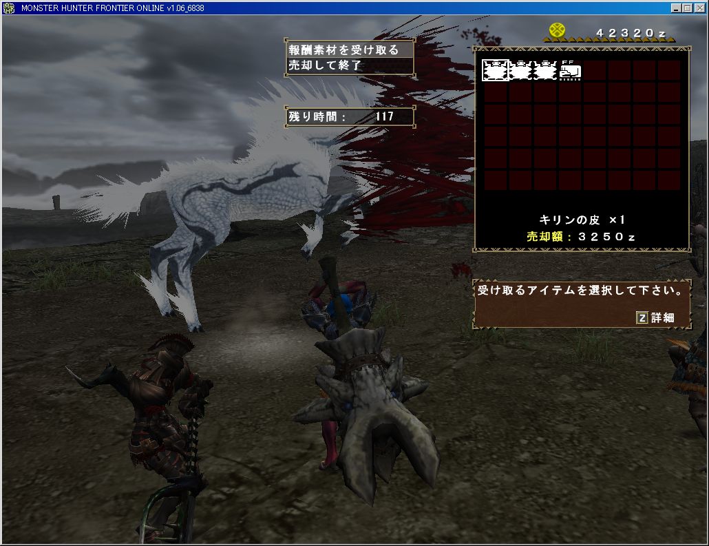 「キリンの上皮」で上位素材、残り1枠は「キリンのたてがみ」で下位素材。なんというしょっぱい報酬。