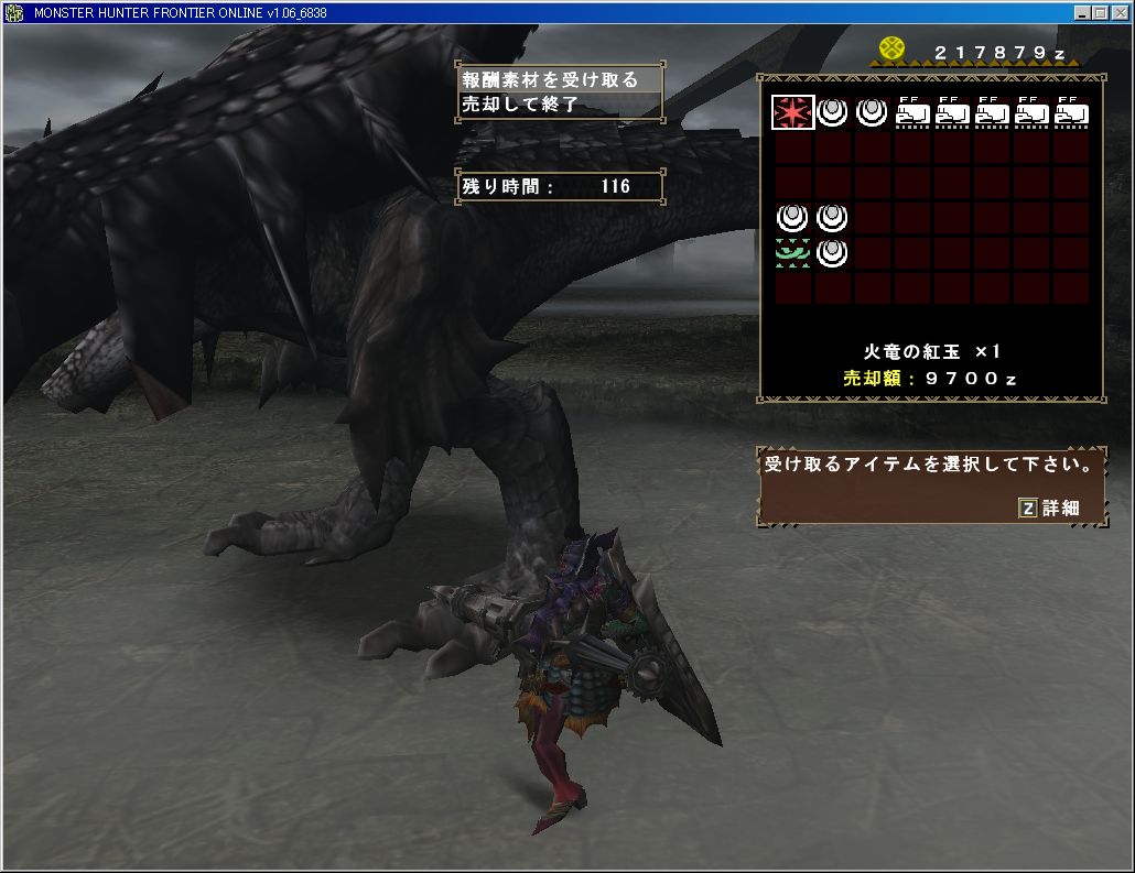 報酬で「火竜の紅玉」が出た!でも逆鱗の方が欲しかった!