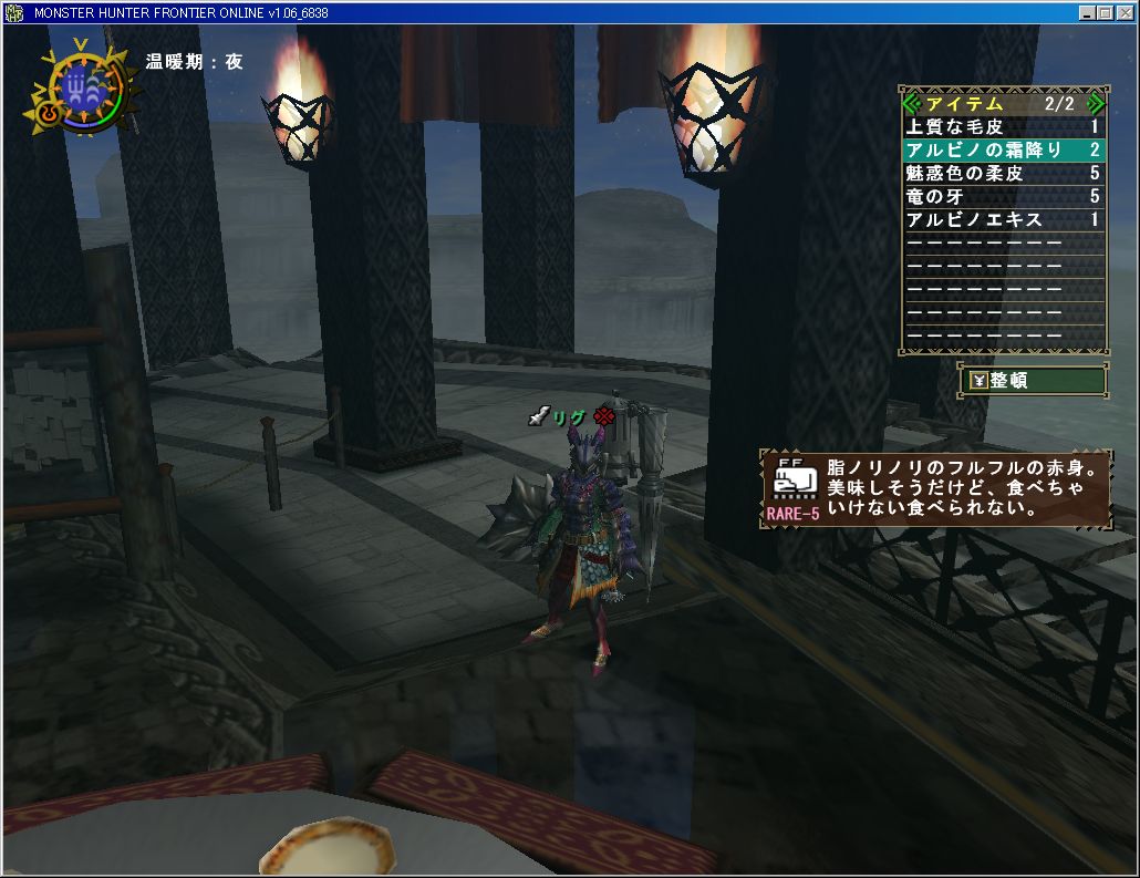 赤フルフルを捕獲したら報酬で「アルビノの霜降り」が2つも出た。中落ちの方をくださあい。