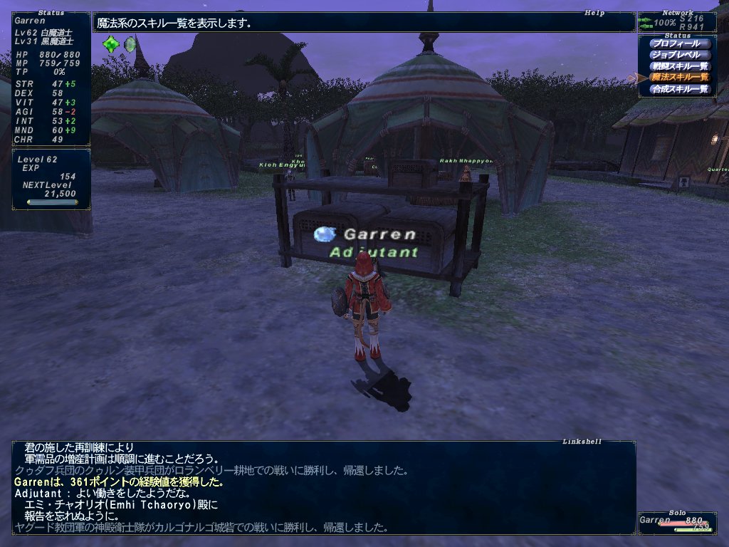 白魔道士でちまちまカンパニエバトルをやって、あと2400弱でLv62になれそうな所でカンパニエopsの受領券が7枚あるのを思い出しました。確か生産支援の職業訓練IVだかで経験値360オーバー貰えたはず。7回失敗無しで終えれば白魔道士Lv62になれそう。