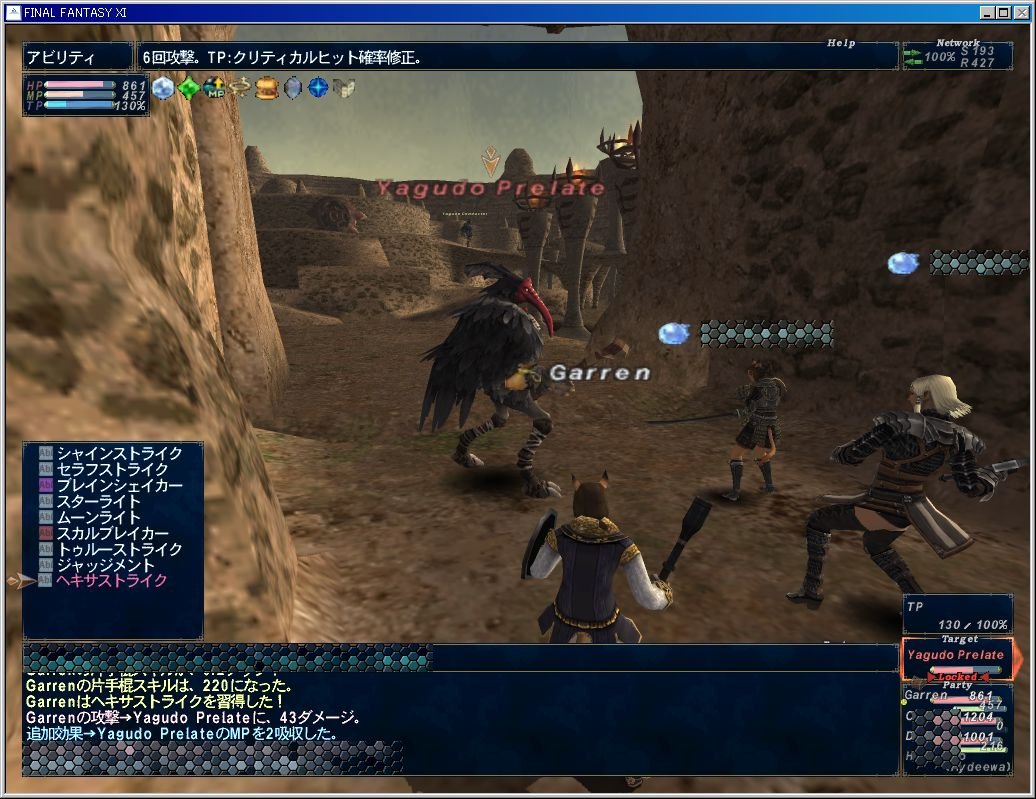 0.3アップとかあると凄く嬉しいのである。あいびーたんはちゃーんと連携して試練之太刀の潜在外しをしてました。パワースラッシュ>五之太刀:陣風で湾曲をだしてたようです。ちゃーんの両手剣が青字になったあとあたりに、私の片手棍スキルも220になってヘキサストライクを習得しました。