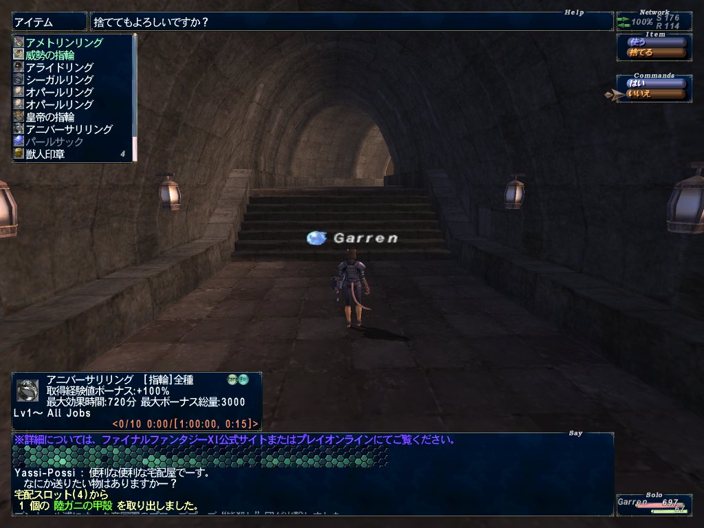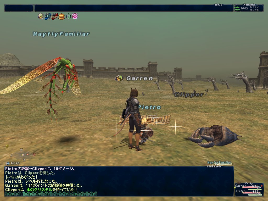 過去での2垢PTは解散して現代での2垢PTをやる。2垢目のキャラはPietroではなくて3垢のPulcinellaを使う。Lv10白魔道士。こいつは一番高いジョブレベルがまだ赤魔道士Lv23である。タロンギで楽~強を狩りまくってLv13に上がる。Garrenはこのとき竜騎士で出撃してLv49になる。