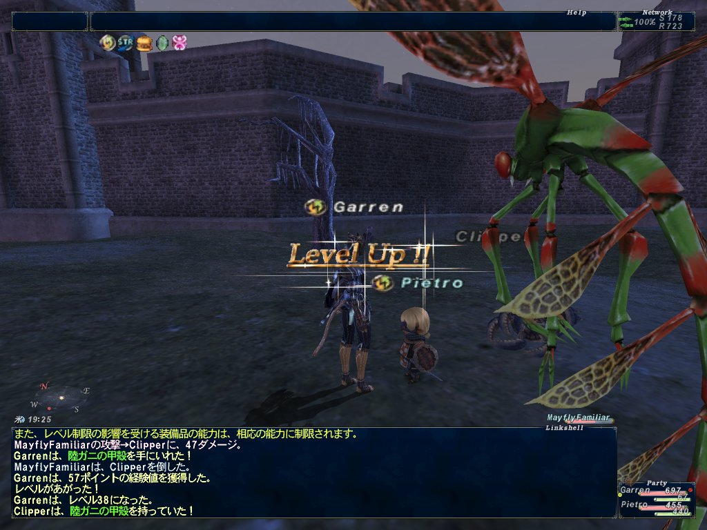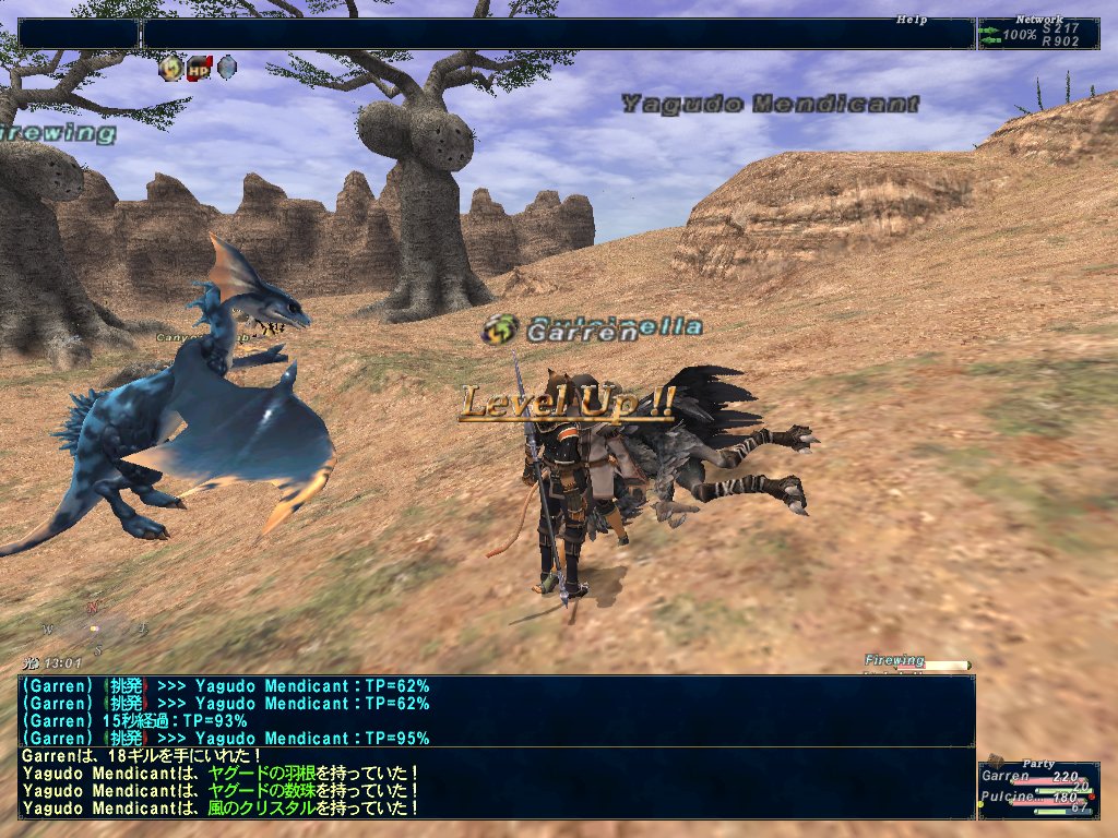 その後、2垢のぴえとろとPTを組んでバタリア丘陵〔S〕でカニを狩る。メインキャラのGarrenはLv37の獣使いを出したっけ?