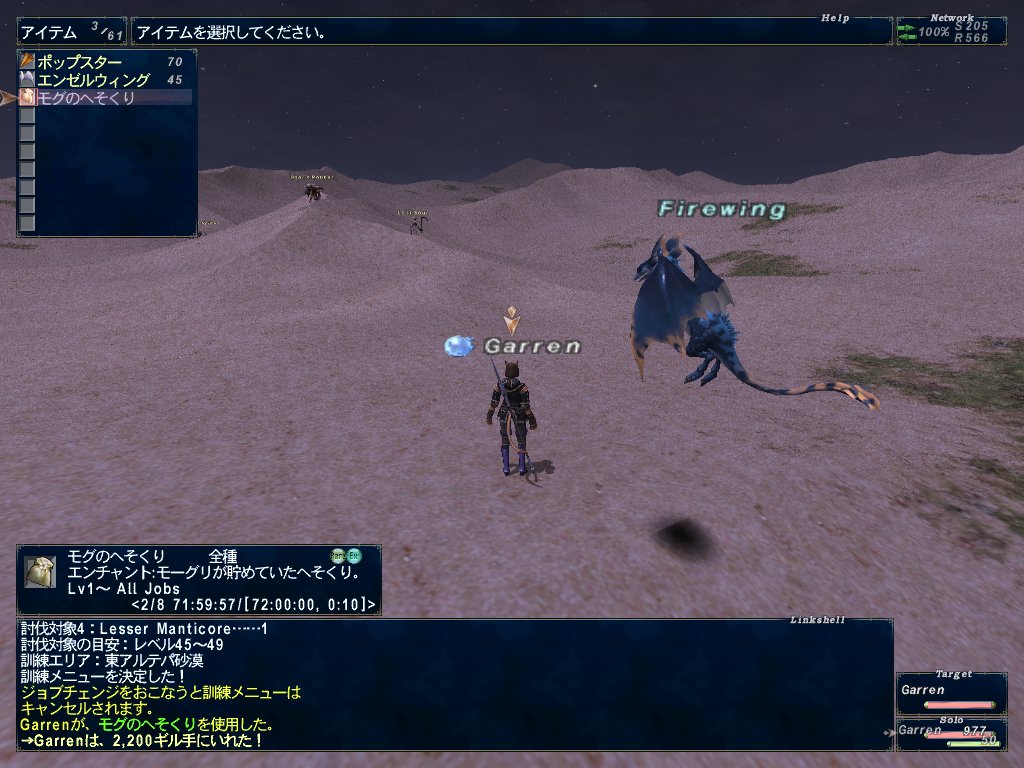 東アルテパ砂漠のFoV5ページ目を3回ほどやって、竜騎士のレベルが56になった。ドラケンフィンガー装備可能レベルになりました。このFoV、1回せいたんと一緒にやったけどそのときはたまにペンタスラストで1000ダメージを超えることがありました。イエローカレーパンを食べてカオスロールを貰っていたから、攻撃力が360を超えていたような気がする。ソロ+イエローカレーパンだと頑張っても700ダメージくらいでした。コルセアの支援能力凄いなぁ。