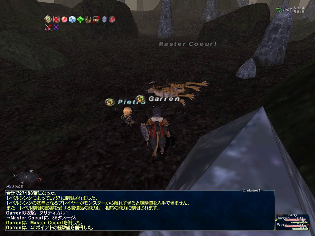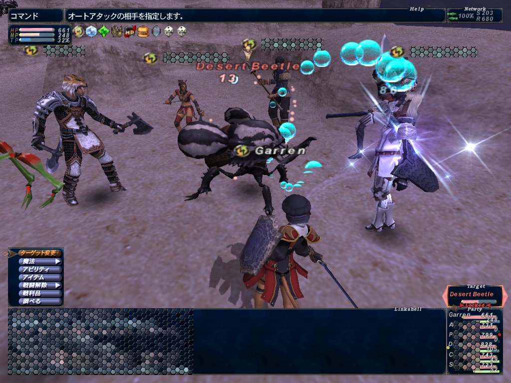 ここでLv45まで狩ったんだったか、えりるたんが眠いので抜けることになった。で、エインから帰ってきたパキスタさんを入れて再び西アルテパ砂漠の岩山周辺でかぶとを狩る。