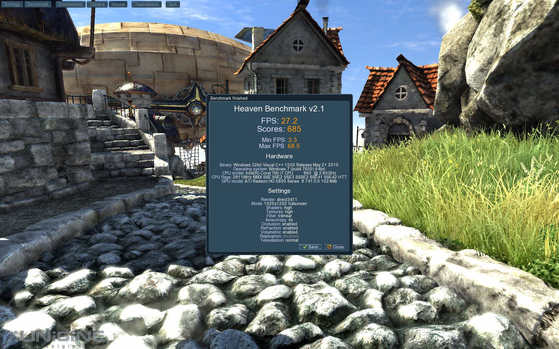 CPUはRadeon HD5870のPCの方がかなり劣っているのに、スコアはやはりRadeon HD5870の方が高い。実際ベンチマーク中の画面を見て見ても、5870の方はカクツキもなく滑らかに表示されることが多かったです。それに比べて5850の方は若干カクつくシーンがあったように見受けられます。