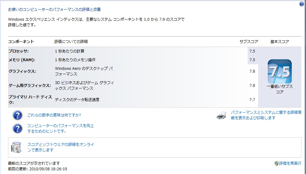 ついでにWindows 7のエクスペリエンスインデックスも実行してみた。