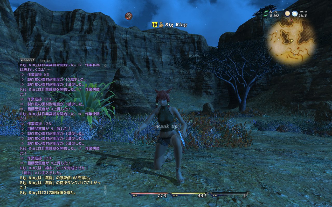 今日の分のギルドリーヴ7つ(傭兵3つ、園芸2つ、採掘2つ)やったので、園芸やりつつ裁縫をやる。草綿が草刈り場から結構取れるので、先日LSリーダーのころりさんとファイアクリスタルと交換したライトニングクリスタルで糸を紡ぐ。成功率9割くらいかな。