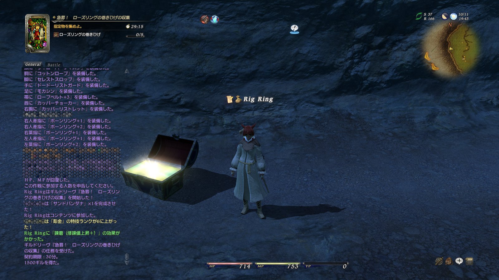 ブラッドショアで報酬の高い18000ギルのリーヴを開始したら宝箱があった!さぞ中身も高額なんだろうなぁと思って開けたらそうでもなかった。