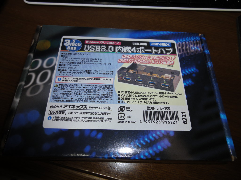先日注文してたUSB3.0ハブが届いたのは一昨日(月曜日)のこと。メインで使っているPCには背部インターフェースとしてUSB3.0ポートが2つあるので、それを使って前面5インチベイに3.5インチUSB3.0ハブを取り付ける。つまり背面の1ポートをハブで前面4ポートにするということです。