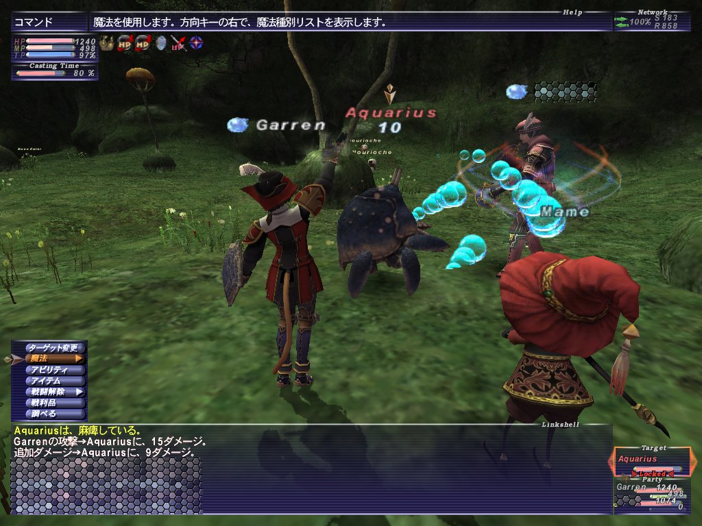 ちゃーんがFF11に復帰したので、限界突破クエ用の魔人印章をゲットしに、アビセア-タロンギに行った。道中にブミがいたのでちゃーんに釣ってもらって戦闘。楽勝で勝利して、だいじなものを無事ゲット出来たらしい。真価のジェイドだったかな。色は忘れたけど。で、適度に空いていそうな場所を求めて奥地の亀エリアまで来た。