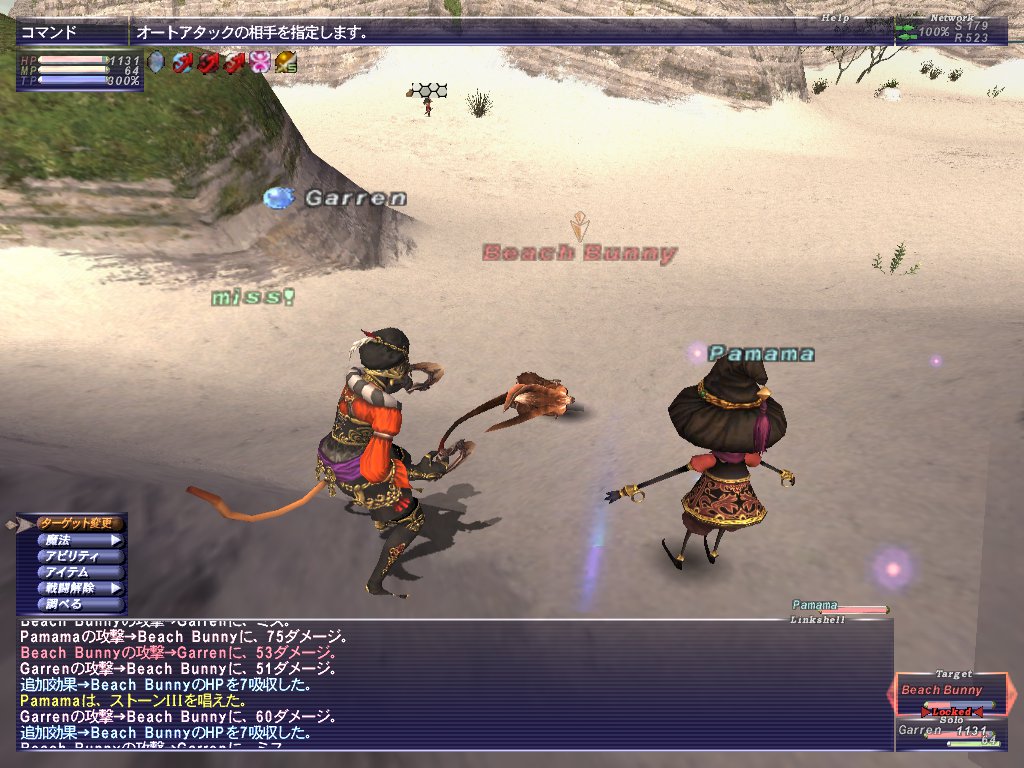一通り堪能したらゴエティア装束はモグの預かり帳で預けて、からくりさんにジョブチェンジしてテリガン岬に飛ぶ。テリガンのウサギとトカゲ取り合いワロタ。全然いない上にからくりさんは釣りアビが無いので、サポ踊り子のA.フラリッシュ頼み。