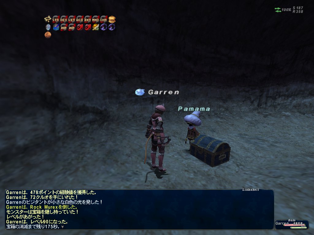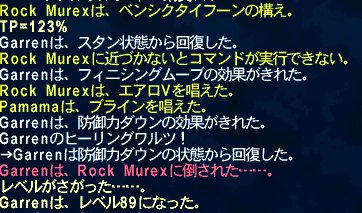 格闘スキル290まであがったぞー!3時間半やってLv89になって、あと2100でLv90になりそうだったので丁度のミュレクスを5匹ほど狩ってみる。こいつ魔導士タイプなんだけど結構強い。なんというかサンダーVとかエアロVをレジストできないので回復が足りないと死にそうになる。でもなんとかLv90になった!