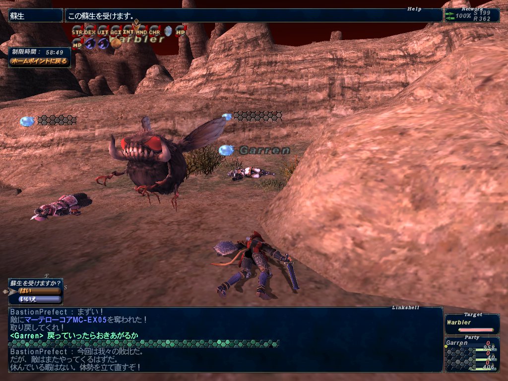 結果は惨敗。つよい。近づきすぎると静寂、毒、アムネジアのフィールドの影響を受けるらしい。近接オートアタックが届くギリギリで戦わないとだめみたい。それから通常攻撃に追加効果:石化があって、頻繁に石化させられる。空蝉張らないときついかも試練。全員空蝉+ストナ要員+抗石化薬とかあるといいかも。今回は起き上がって死者にレイズして帰る。