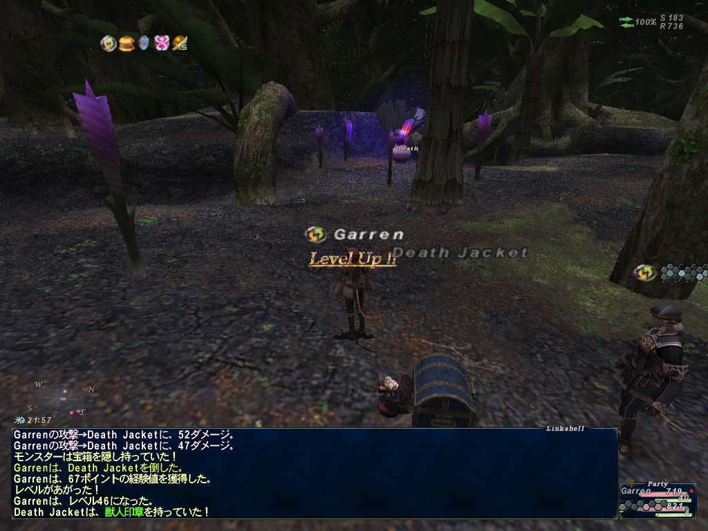 つんたんとえりんぎさんが落ちたので、私とちゃーんの2人でユタンガ大森林のFoVをやる。Lv45シンクでハチ7、ゴブリン4の項目。5回くらいFoVをやってLv47になったんだったかな。ちゃーんもレベル1個上がったらしい。