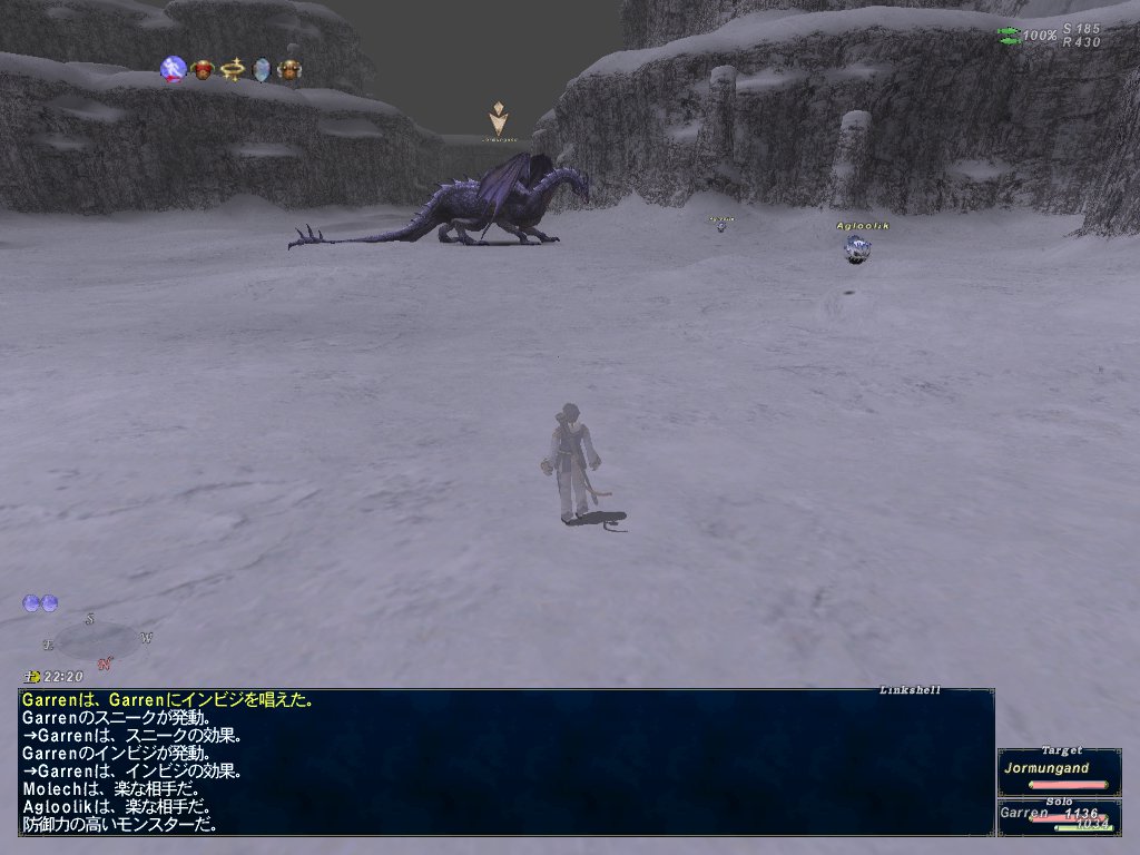 ウルガラン山脈の地図を持っていなかったので、クエストを受けてもらいに行く。どうも南の斜面を滑り落ちて最下段の東側の穴に入ればいいらしいのでそのようにする。特に問題なく滑り落ちて地図ゲット。道中、ヨルムンガンドが居て放置されてた。