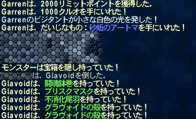 今度は砂蚯のアートマが出たよー。エンピ固定参加者希望のグラヴォイドの殻も2つでたよー。そんな感じで今日のアビセアNM討伐活動は終わった。