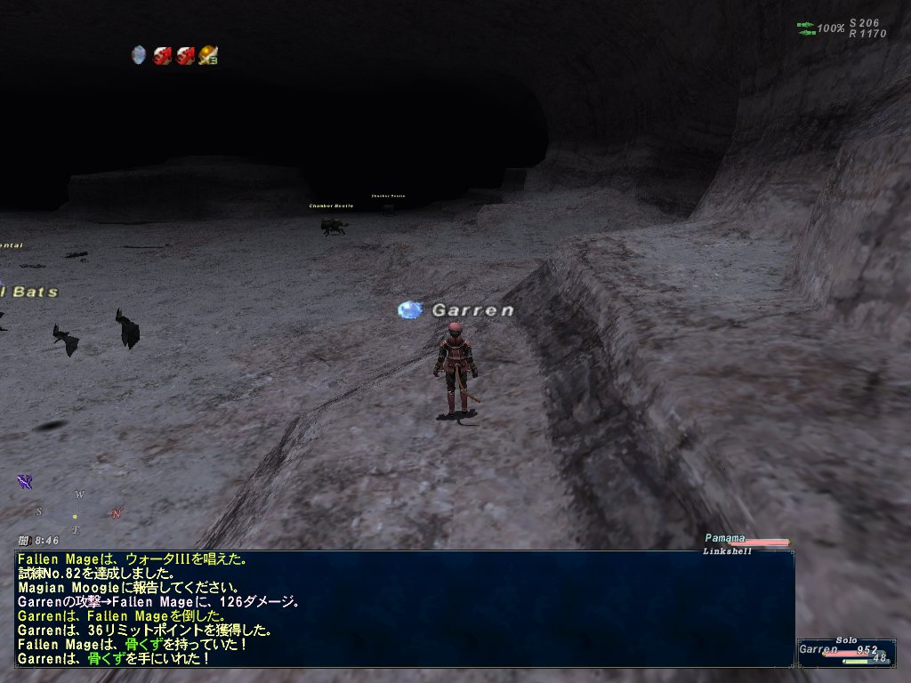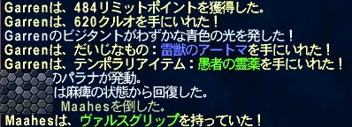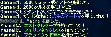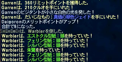 それからクァールNMをやったら、即死WS発動で盾のぱっきー死亡。雑魚も3リンクくらいして死んだ。戦闘位置が悪かった気がする。でもなんとか全員蘇生して勝利。
