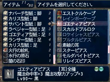 それからアビセア-アルテパに行ってコカトリスNMとロックNMを狩る。シーフの手型紙とか赤の手型紙とかゴエティアピアスとかをゲットして帰る。