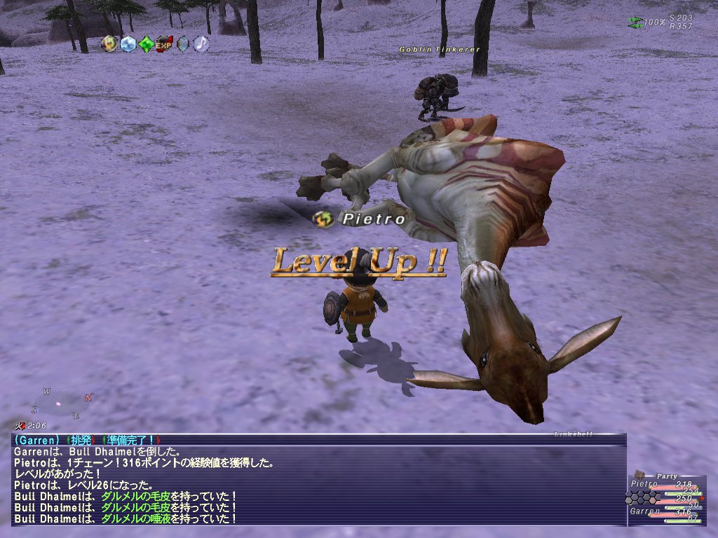 夕食後、レベルシンクPTをやる。しりさんの詩人にシンクして、ブブリムでダルメル、イモ虫を狩りまくる。ゴブリンもつまむ。
