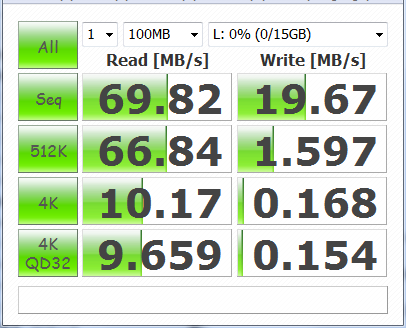 これはUSB2.0ポートに繋いだ時のCrystal Disk Markの結果。