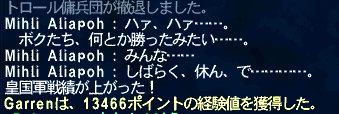 晩飯前にトロールLv8がビシージに来そうだったので、10分強、2垢で参加してケアルとかオートアタックして稼ぐ。で、晩飯を食べに行って帰ってきたら、20分前後でトロール軍は撤退したらしい。