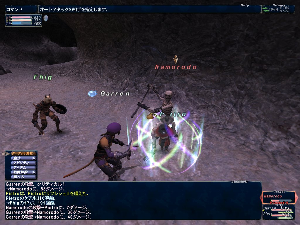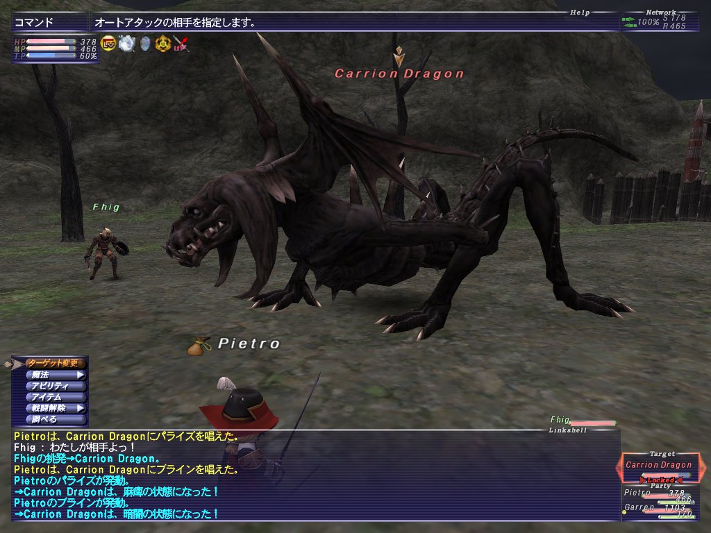 次はゲルスバ野陣営でドラゴンNM戦。某情報サイトによると40制限3人まで入れるBFらしい。これも踊り子ギャレンを連れて行く。でも何故かギャレンが入れない。うーむ、クエストクリアしてると入れんのかな。だがLv40赤魔道士ピエトロソロで余裕だった。