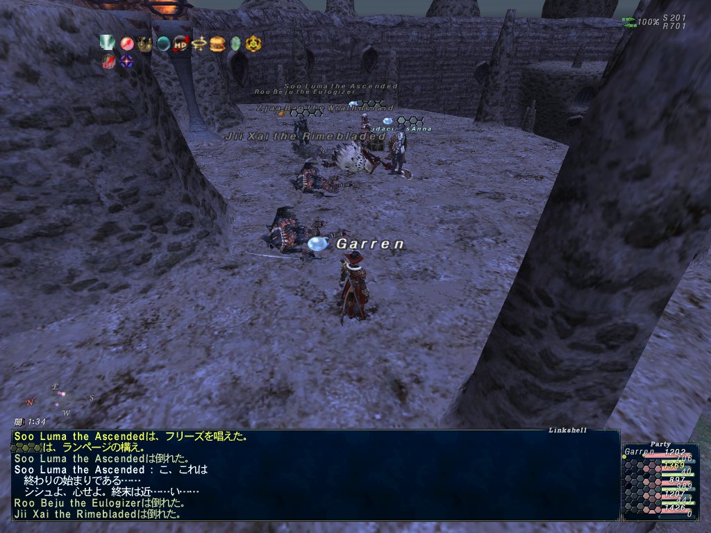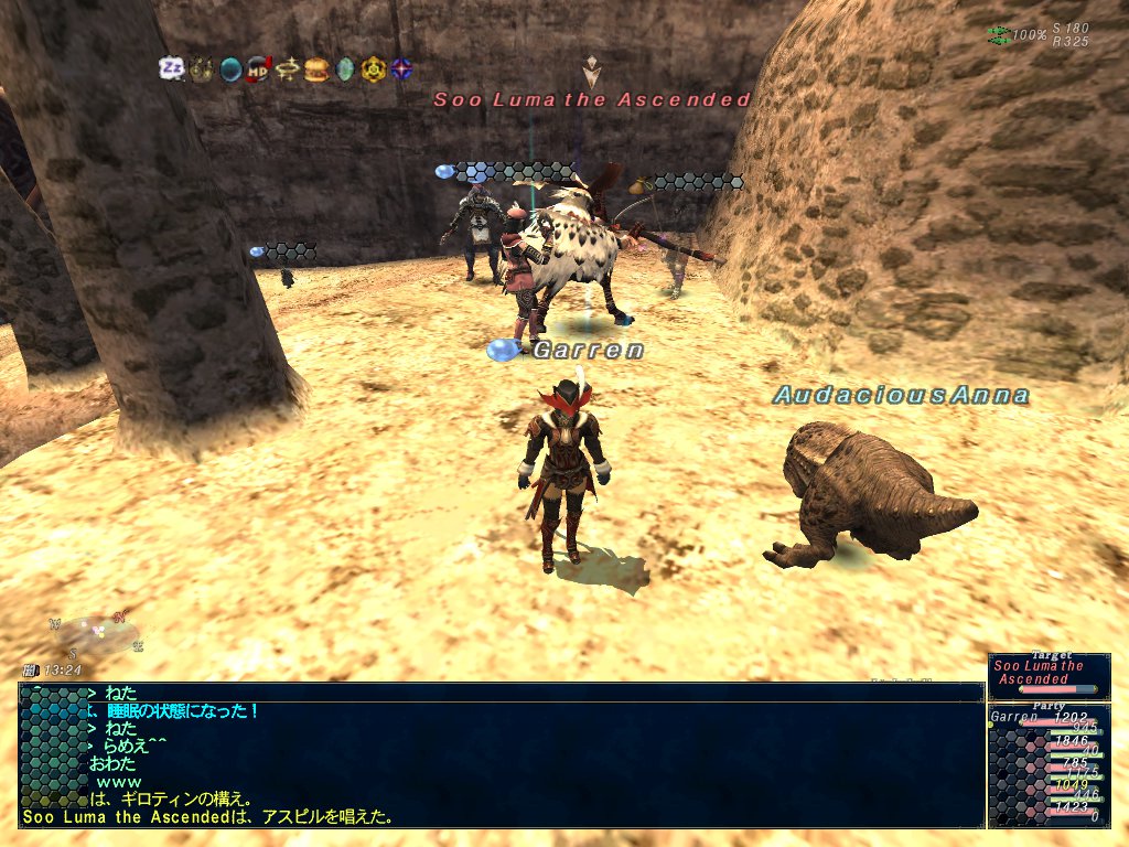 ソー・ルマさんの範囲化されたスリプルでペットも含めて全員寝る。全滅したかと思ったけど、案外早く睡眠が解けた、というか範囲攻撃の鎌鼬を食らって起きた気がする。その後、ソー・ルマさんをフルボッコ。