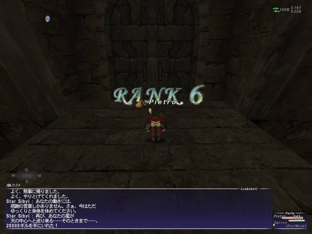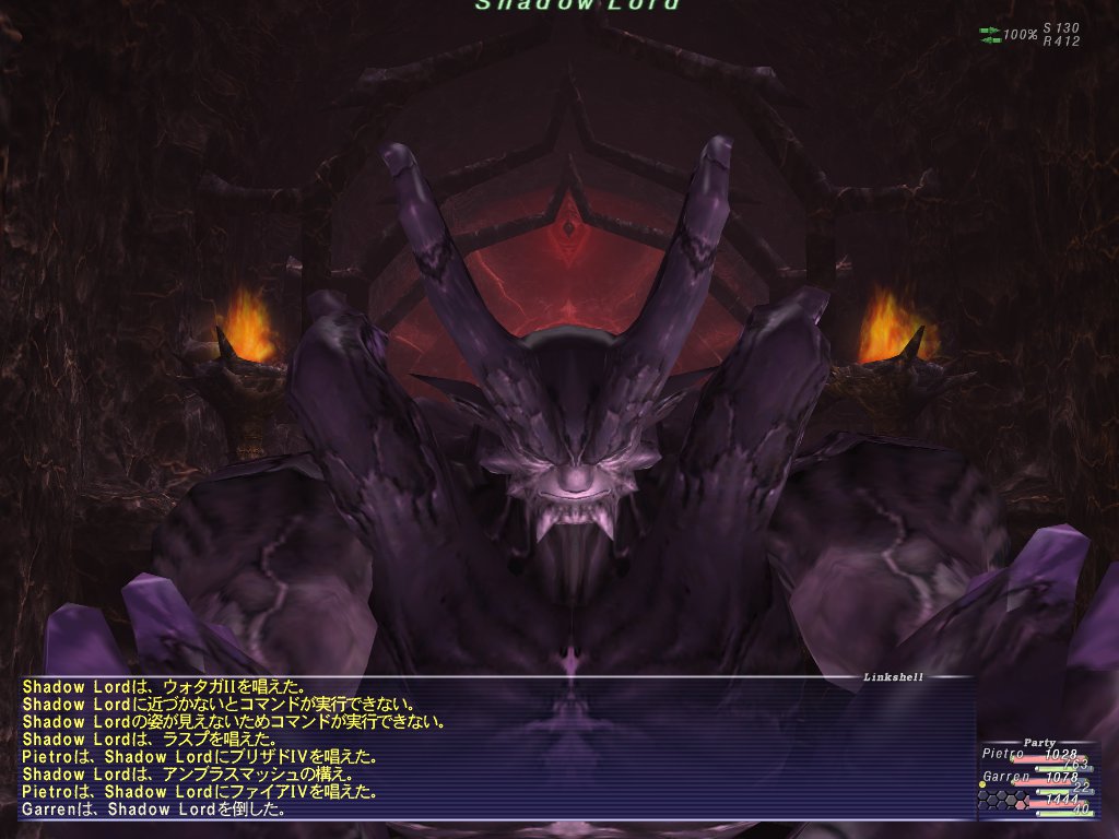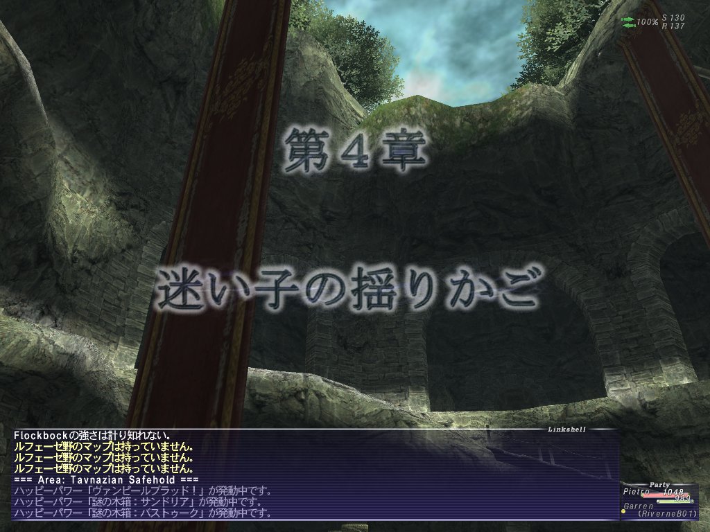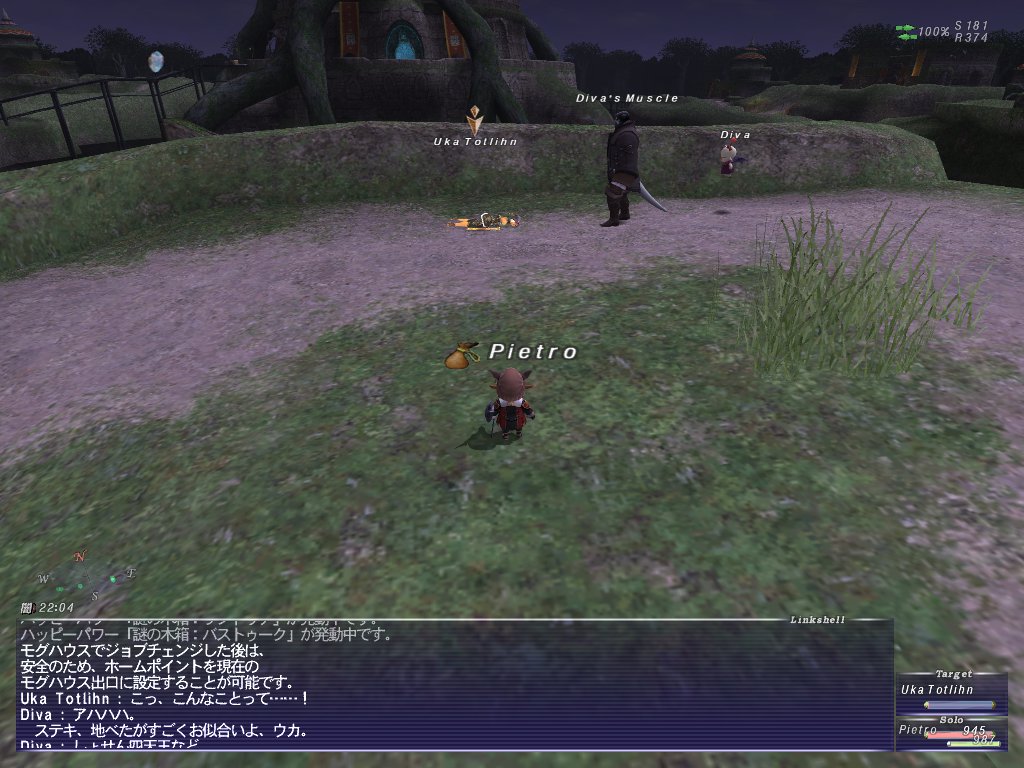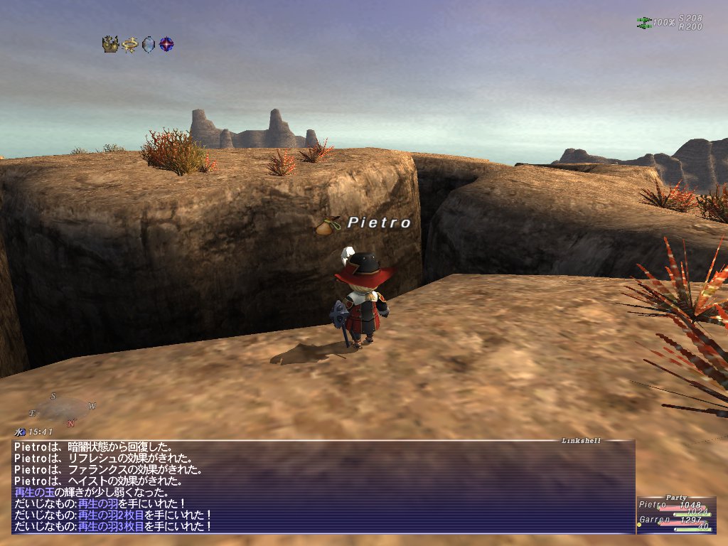 それからプロマシアミッション。ふたつの道をやるべくジャグナーからギルド桟橋に行く途中、Garrenのアルタナミッション「黒い泪、白い涙」のNM樹人戦をやってみた。90が2人とペットなら勝てるだろう。うん、勝てた。
