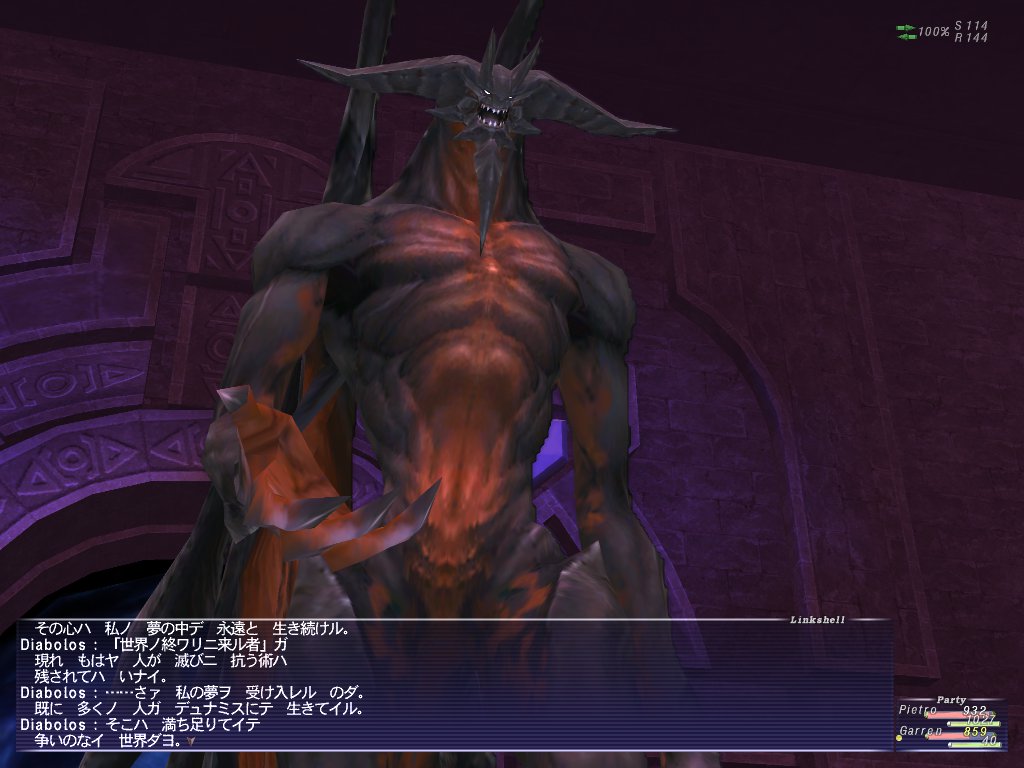 で、ソ・ジヤでディアボロス戦。ナイトメアで寝かされてゴリゴリ削られたけど、ナズナさんが起きて倒してくれた。争いのなイ 世界ダヨ。