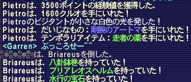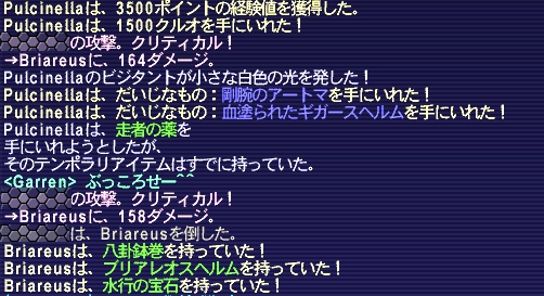 プルチネッラが撃てるには撃てるけどTPがない。被弾して死んだときにTP+5。ギャレンでルシドウィングスを使ってTP+60。ピエトロでルシドウィングスを使ったけど別PTだったので効果無し。うーん。プルチネッラで後ろからブリアレウス殴ってたけど、当たっても0ダメージでTP貯まらない…。とか思ったら、テンポラリの中に王者の薬があった!リゲイン効果の薬。多分WS1回分しかTPないので、敵のWS後にレッドロータスを撃つ。赤弱点付けたのでせいたんにモリモリ削ってもらって倒す。