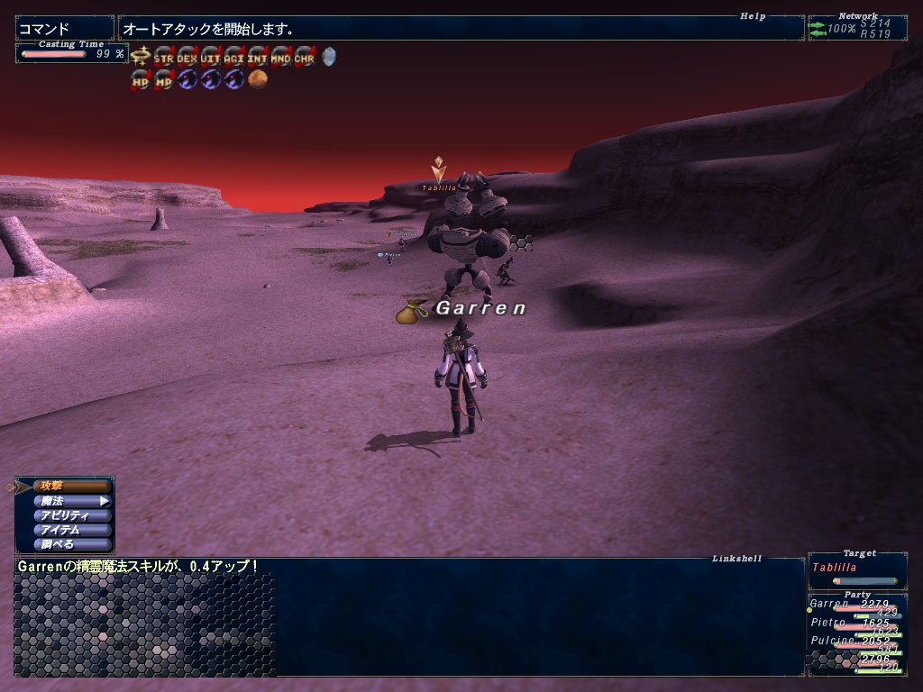 アビセア-アットワでぽちっこの黒足を取りにいったけど、白足1個しかでなかった。エルカでスキル上がったからうまかった。その後、私の赤頭型紙を取りにミミズNMをやりに行ったけど、レイダーと雲海しかでなかった。3~4回やったけどだめだった。@1枚なんだけどなー。