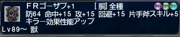 FRゴーザプ+1[胴]防64 命中+15 攻+15 回避+15 片手斧スキル+5 キラー効果性能アップ→