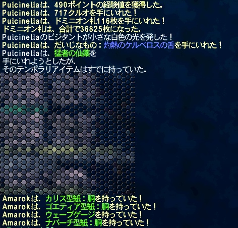 その後、居るメンバーでアビセア-アルテパの下位ケルベロスと上位ケルベロスを…合計10戦以上やった。型紙と原石がいっぱい出て…もちろん出なかった型紙とかもあるけど、私の分の黒胴型紙とぷるさんのナイト胴用の原石が集まった。しりさんのゴエティア胴とかクリード胴がまだだったかなー。