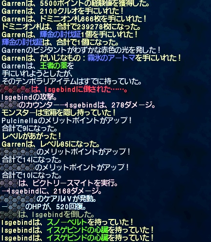 最後の方でメインディッシュのイスゲビンドと戦った。強力なブリザド系魔法と麻痺フィールドがウザイ。青魔道士でP.エンブレイスしまくってたらタゲがふらついてフレイルスパイク直撃で死んだりしたけれど、私は元気です。